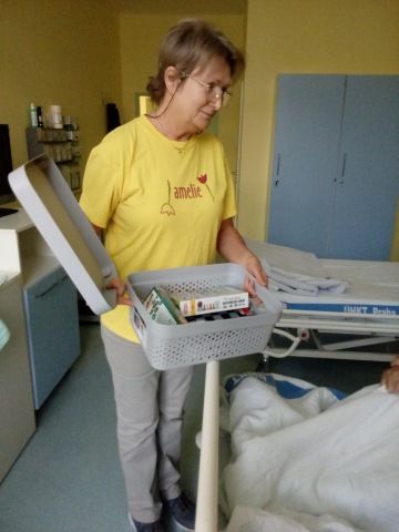 Telefony umožní zprostředkovanou a pravidelnou komunikaci pacientů s dobrovolníky Amelie, kteří docházejí za jinými pacienty na lůžka. Pacienti si tak budou moci popovídat s někým mimo systém, sdílet strasti i radosti svého odloučení, které je v v tomto složitém období ještě těžší a také budou moci dostat informace, které mohou potřebovat. Vedení a zaškolení dobrovolníků i předání telefonů zajišťuje nezisková organizace Amelie, z.s.