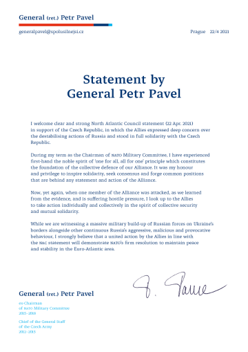 Nabídl jsem pomoc naší zemi. Obracím se na spojence. Chci podpořit žádost naší země o konkrétní společný postup při obraně naší suverenity a jednoty aliance. Věřím, že se k podpoře přidají i další nestátní autority, aby poselství z ČR bylo co nejsilnější.